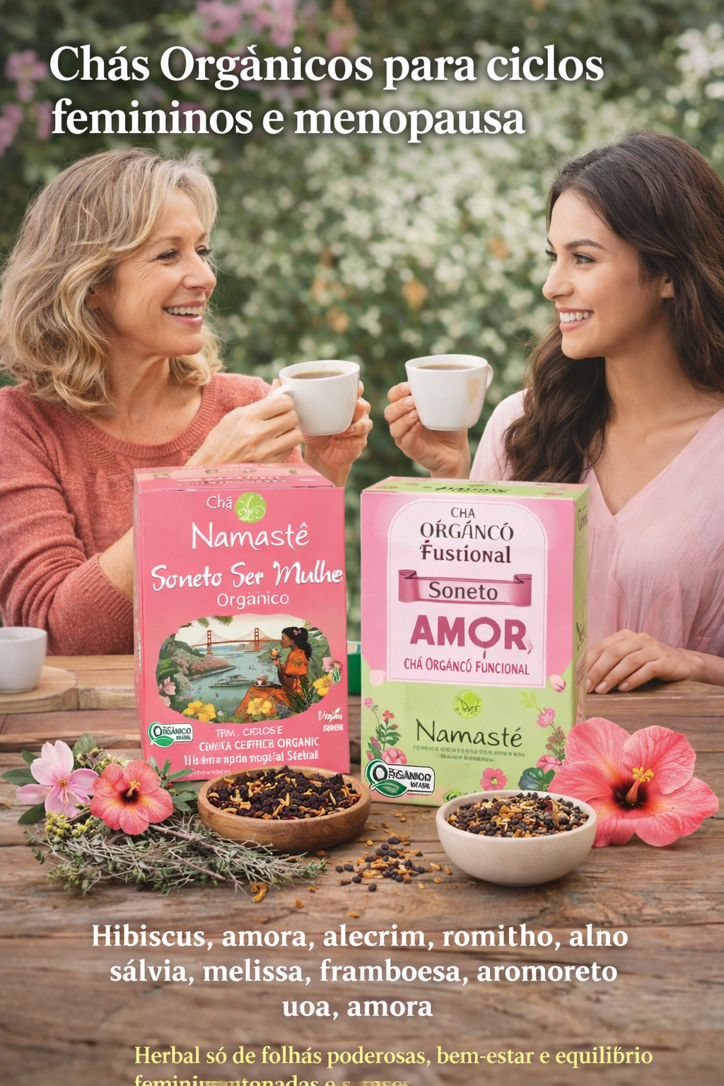 O Chá Soneto Ser Mulher Orgânico foi pensado para acompanhar o organismo feminino durante ciclos menstruais e menopausa, proporcionando conforto e harmonia.