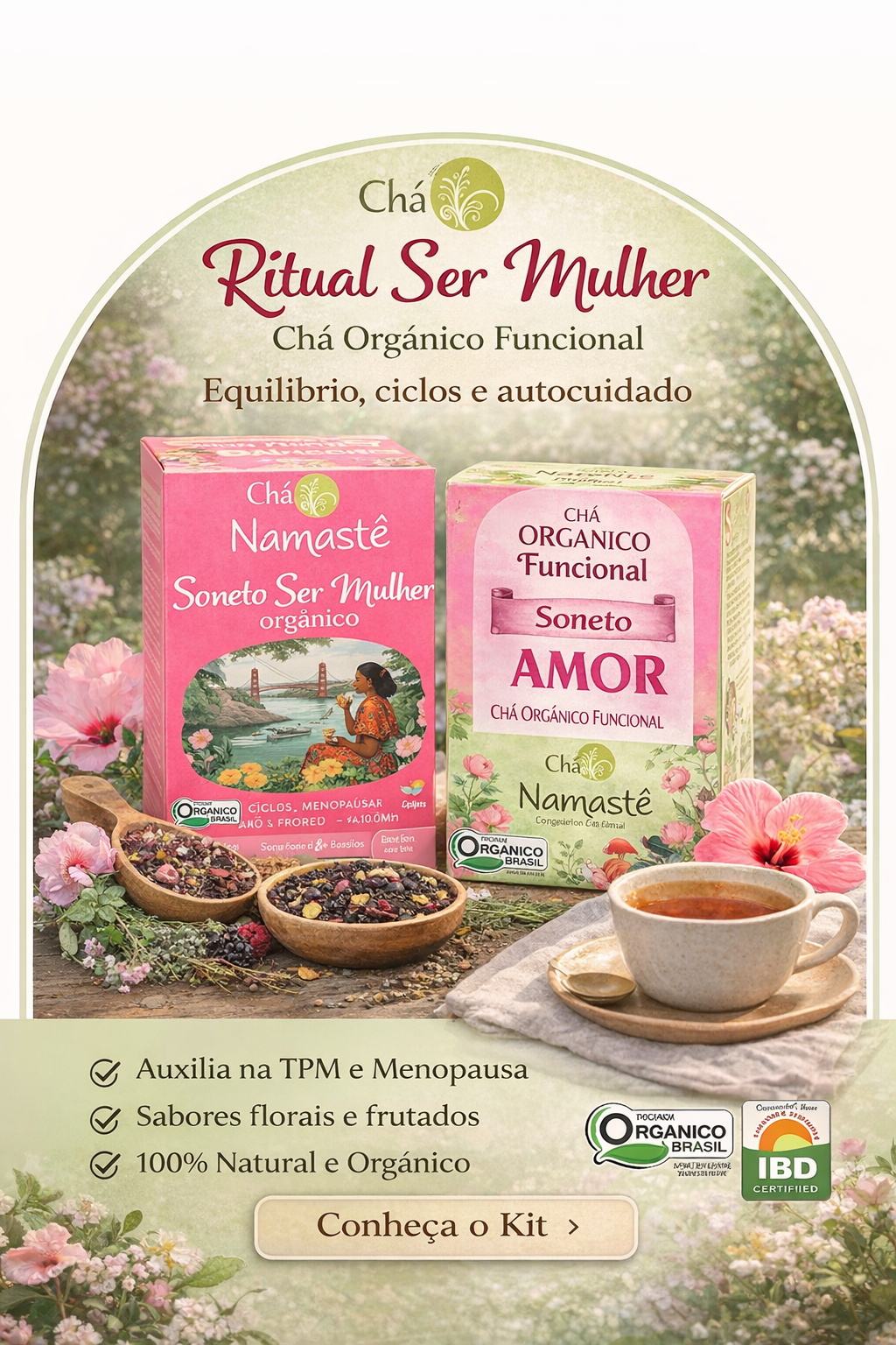 O kit Chá Orgânico para Ciclos Femininos Namastê – Soneto Ser Mulher + Soneto Amor reúne dois blends exclusivos desenvolvidos para promover bem-estar, equilíbrio e conexão com o corpo feminino em diferentes fases da vida.
